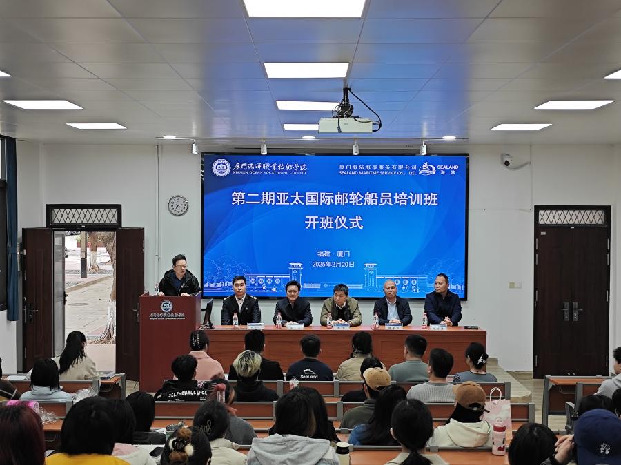 2月20日下午,第二期亚太国际邮轮船员培训班开班仪式在我校思明校区报告厅举行。厦门海事局船员处副处长魏栋,厦门海陆海事服务有限公司总经理张振捷,我校继续教育学院院长林金华、安全处副处长汪正纲、航海学院副书记赵世一及相关工作人员和培训学员共计50余人参加开班仪式。