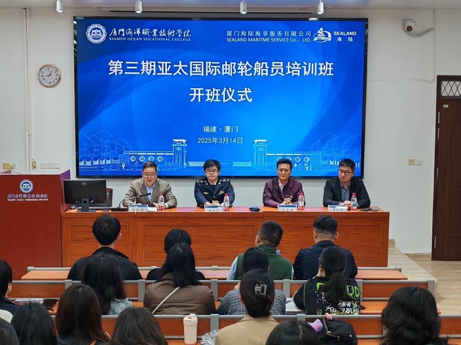 3月14日上午,第三期亚太国际邮轮船员培训班开班仪式在我校思明校区报告厅举行。厦门海事局船员处钟若凡,厦门海陆海事服务有限公司副总经理李乐天、我校安全处副处长汪正纲、继续教育学院院副院长付乾坤及相关工作人员和培训学员共计50余人参加了开班仪式。