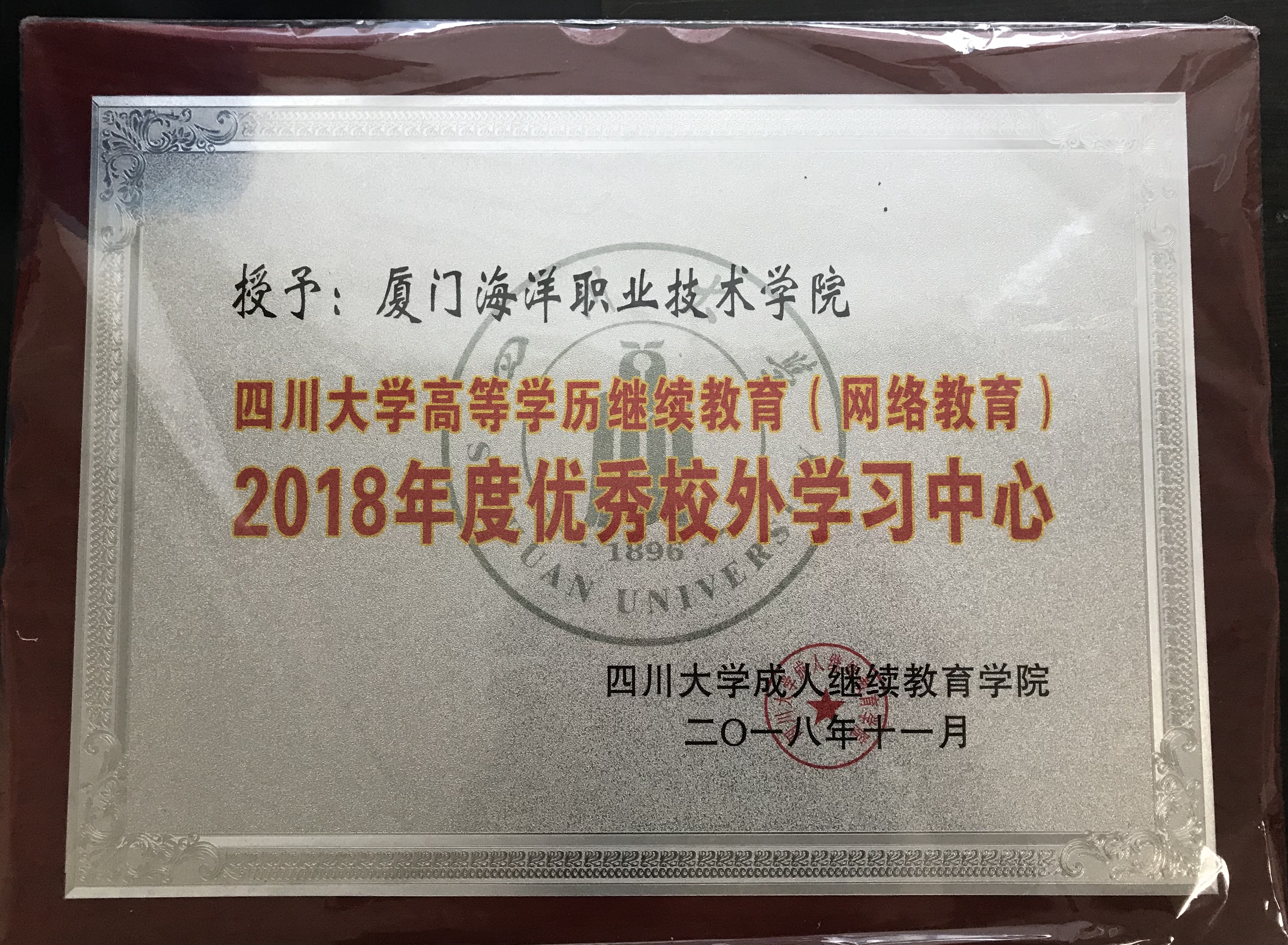 近日,四川大学成人继续教育学院授予我院2018年度“优秀校外学习中心”荣誉牌匾并授予林晓烨老师“招生先进个人”荣誉称号。这是对我院网络教育工作的再次肯定,此前我院已4次获评四川大学成人继续教育学院“优秀校外学习中心”。