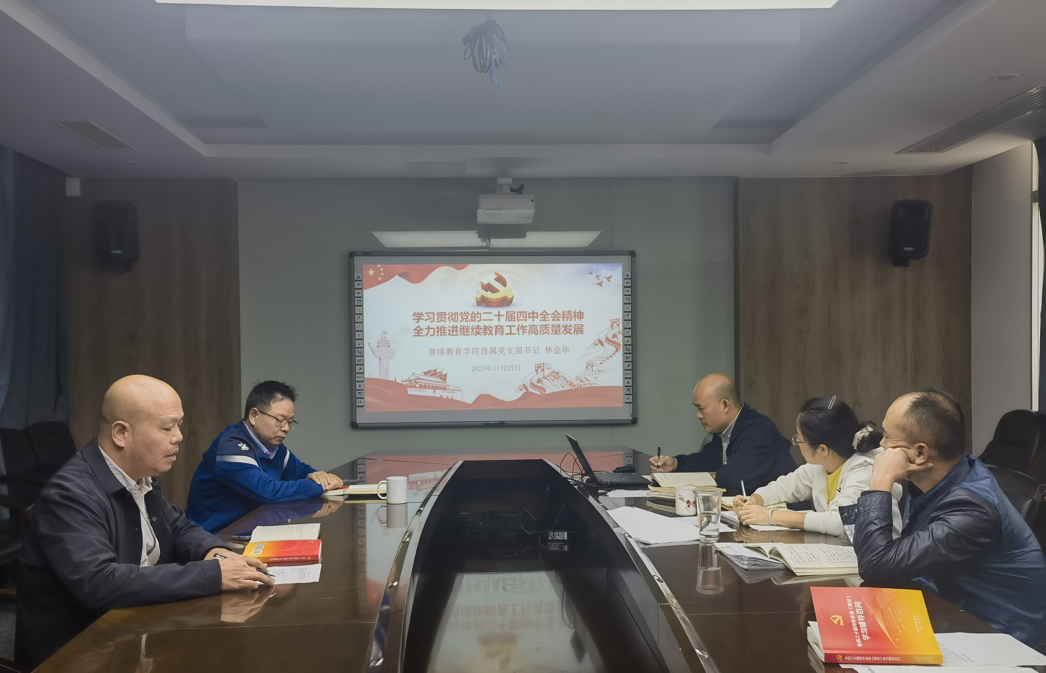 会上,林金华作了“学习贯彻党的二十届四中全会精神,全力推进继续教育工作高质量发展”主题报告,就如何学好习近平总书记在党的二十届四中全会上的讲话精神、全会公报和《中共中央关于制定国民经济和社会发展第十五个五年规划的建议》进行辅导。在交流讨论环节,各位党员结合岗位工作分享了学习心得体会。